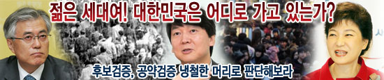 수없는 선거를 통해 후보검증과정을 거친 박근혜 후보도 매번 선거 때만 되면 검증의 단두대에 올라서는데 제대로 알려진 것이 없는 안철수 후보와 문제인 후보는 요리조리 검증의 칼날만 피해가는 모습이다. 국민이 끌려가면 안 된다. 제대로 길을 가도록 호된 채찍질을 가해야 한다. 지금은 매섭지만 그래야만 나라가 바로 선다, 이 땅의 젊은 세대여 가슴을 비우고 냉철 머리로 과연 대한민국이 어디로 가야 하는지 꼭 한번 되짚어 보기를 바라마지 않는다.
