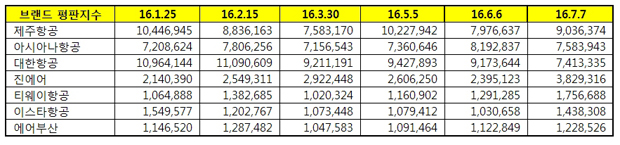 한국기업평판연구소는 2016년 6월 6일부터 2016년 7월 7일까지의 6개 국내 항공사 기업 브랜드 빅데이터 32,286,490개를 분석하여 소비자들의 참여와 소통, 소셜량을 측정하였다. 지난 6월 항공사 브랜드 빅데이터 31,183,033개와 비교해보면 13.29% 상승했다.