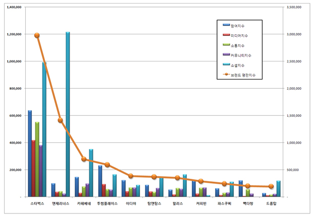 1위, 스타벅스 브랜드는 참여지수 636,000 미디어지수 417,360 소통지수 551,489 커뮤니티지수 378,797 소셜지수 991,708로 브랜드평판지수 2,975,355로 분석되었다.