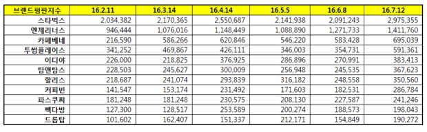 한국기업평판연구소는 국내 브랜드의 평판지수를 매달 측정하여 브랜드 평판지수의 변화량을 발표하고 있다. 이번 커피 브랜드 평판지수는 2016년 6월 10일부터 7월 11일까지의 브랜드 빅데이터 분석 결과이다.