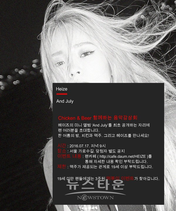헤이즈는 음감회를 통해 미니앨범의 타이틀곡과 수록곡을 팬들에게 제일 먼저 선보이는 것은 물론, 치킨과 맥주를 제공하며 무더위를 식힐 예정이다.