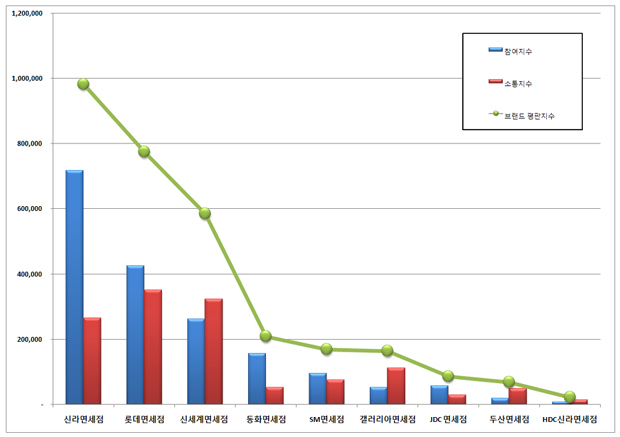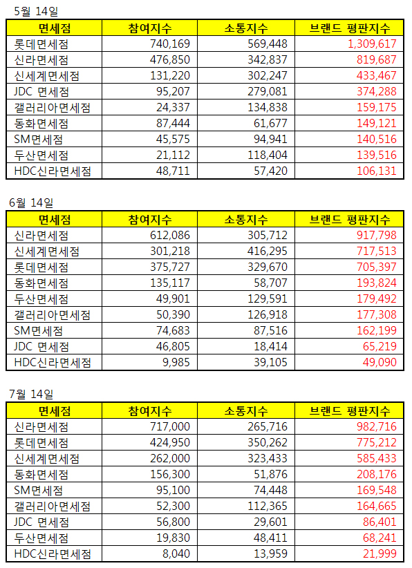 1위, 신라면세점 브랜드는 참여지수 717,000 소통지수 265,716로 브랜드평판지수 982,716로 분석되었다.  지난 6월 브랜드평판지수 917,798보다 7.07% 증가했다.