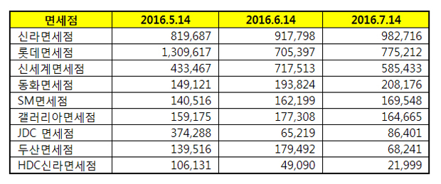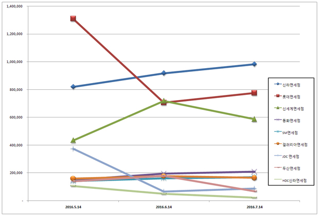 한국기업평판연구소는  2016년 6월 13일부터 2016년 7월 14일까지의 9개 국내 면세점 브랜드 빅데이터  3,062,391개를 분석하여 소비자들의 브랜드 참여와 소통량을 측정하였다.  지난 6월 브랜드 빅데이터 3,167,840개와 비교해보면 3.33% 줄어들었다.