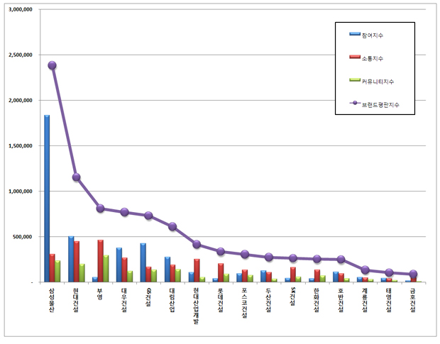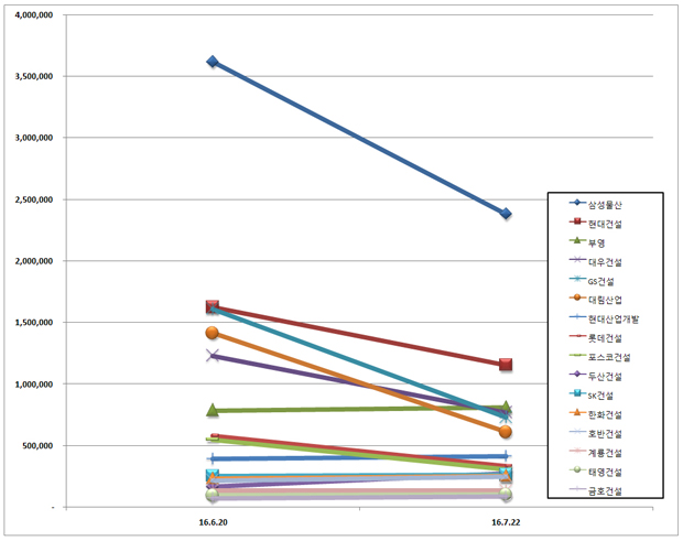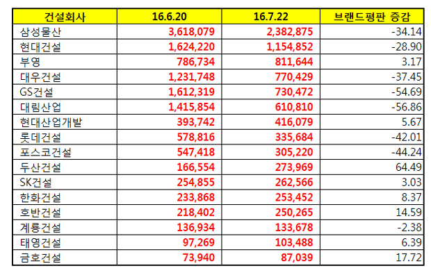 한국기업평판연구소는 2016년 6월 20일부터 2016년 7월 21일까지 건설회사 브랜드 16개의 브랜드 빅데이터 8,882,522개를 분석하여 소비자들의 브랜드 참여와 소통량과 브랜드에 대한 긍부정 비율을 측정하였다.  지난 6월 건설 브랜드 빅데이터 12,990,752개와 비교해보면 31.62% 상승했다.