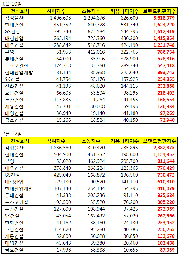 국내 건설회사 브랜드에 대한 소비자 평판 7월 조사결과...삼성물산 1위, 현대건설 2위로 분석되었다.