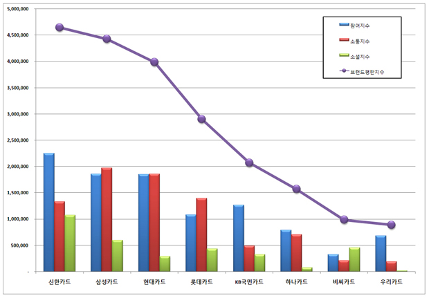 1위, 신한카드 브랜드는 참여지수 2,248,600 소통지수 1,328,877 소셜지수 1,069,848로 브랜드평판지수 4,647,325로 분석되었다. 지난 6월 브랜드평판지수 3,601,382보다 29.04% 상승했다.