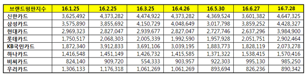 한국기업평판연구소는 2016년 5월 26일부터 2016년 6월 27일까지의 8개 국내 카드 브랜드 빅데이터 17,337,581개를 분석하여 소비자들의 참여와 소통, 소셜량을 측정하였다. 지난 6월 카드사 브랜드빅데이터 21,482,302개와 비교하면 23.91% 증가했다.