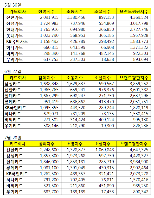 한국기업평판연구소는 국내 카드사 브랜드 빅데이터를 분석하여 브랜드 평판지수를 파악했다. 7월 브랜드평판조사에서는 신한카드, 삼성카드, 현대카드, 롯데카드, KB국민카드, 하나카드, 비씨카드, 우리카드에 대한 빅데이터 분석으로 이루어졌다.
