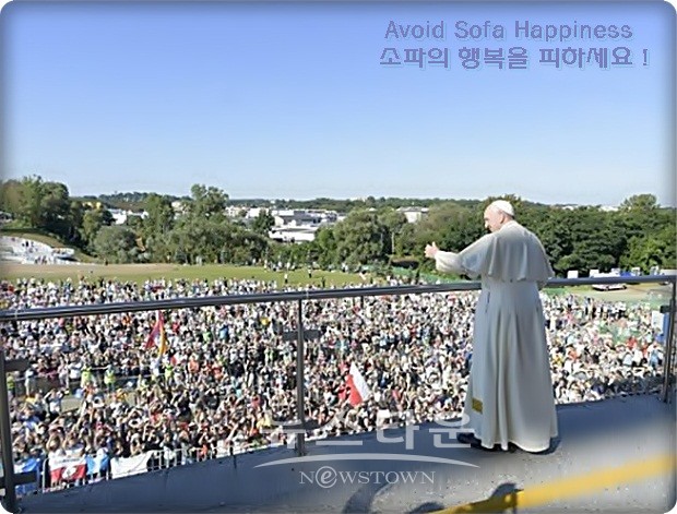 ▲ 프란치스코 교황은 젊은 청년들에게 “마비는 행복과 소파를 혼동하는데서 오는 것(avoid sofa happiness : 소파의 행복을 피하라)”이라고 지적하고, “쉽고 편안한 길만을 선택할 경우, 자유를 잃어버리는 큰 대가를 치르게 된다”고 강조 ⓒ뉴스타운