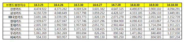 한국기업평판연구소는 2016년 9월 28일부터 2016년 10월 29일까지의 8개 국내 카드 브랜드 빅데이터 18,922,157개를 분석하여 소비자들의 참여와 소통, 소셜량을 측정하였다. 지난 9월 카드사 브랜드빅데이터 16,488,085개와 비교하면 14.76% 늘어났다.