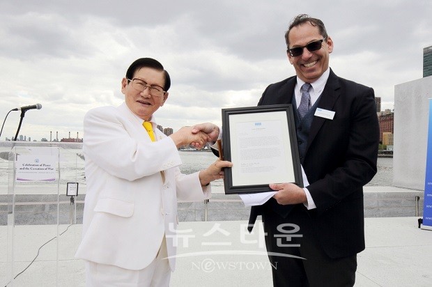 ▲ 지난 5월 8일 미국 뉴욕 프랭클린 루즈벨트 자유공원에서 HWPL 이만희 대표가 루즈벨트 자유공원 창립자(하드워드 악셀 대리수여)측 으로부터 평화공로상을 수여받고 있다. ⓒ뉴스타운