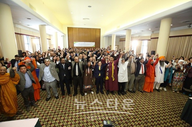 ▲ 5월 6일 뉴욕 펜실베니아 호텔에서 열린 종교 지도자 모임에서 참석자들이 기념쵤영을 하고 있다. ⓒ뉴스타운