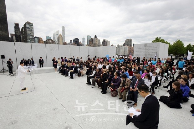 ▲ 지난 5월 8일 미국 뉴욕 프랭클린 루즈벨트 자유공원에서 HWPL 이만희 대표가 지구촌 전쟁종식과 세계평화에 대한 발제를 하고 있다. ⓒ뉴스타운