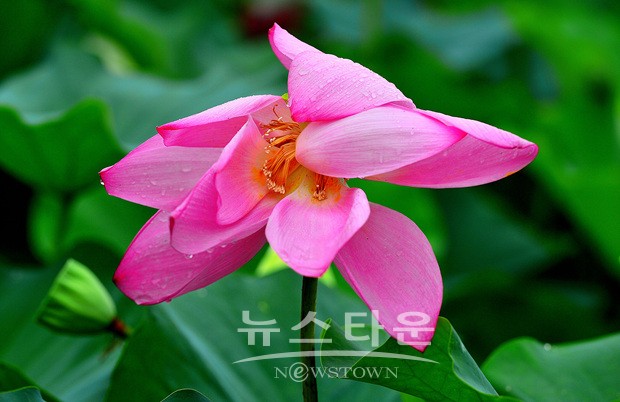 비를 맞은 연꽃은 커다란잎사귀에 축 늘어진다.