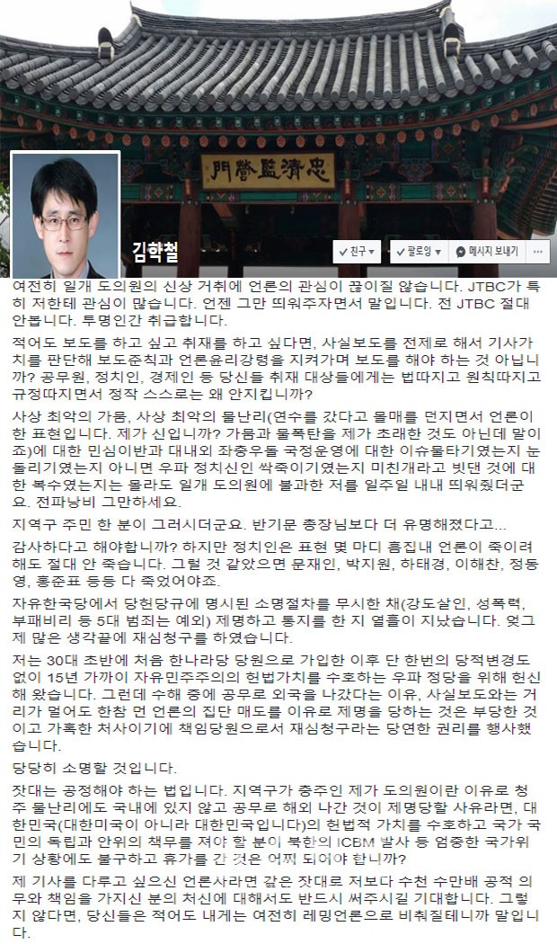 문재인 대통령이 북한의 ICBM 발사 상황에서 ‘묻지마’ 휴가를 떠나 논란이 큰 가운데, 지난 청주 수해 때 해외연수를 나갔다 언론과 여론의 몰매를 맞은 김학철 충북도의원이 2일 밤 자신의 SNS 페이스북에 올린 글이 다시 화제다.