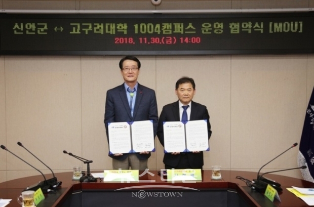 신안군과 고구려대학은 2018년 11월 30일(금) 공무원 현장교육 및 직무능력 향상을 위해 신안군에 2개 계약학과 설치 운영을 협력하는 “신안군 1004 캠퍼스 운영협약(MOU)”을 체결하였다.