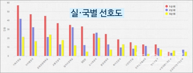 한편 광주시 직원들은 기획조정실, 자치행정국, 문화관광체육실 순으로 선호하는 것으로 나타나 여전히 공직사회는 업무 강도가 높아도 보직관리와 승진에 유리한 실국 주무과가 인기가 많은 곳임을 확인할 수 있었다.