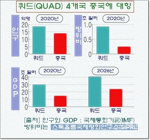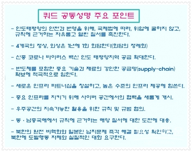 대중국 포위망 구축을 서두르고 있는 조 바이든 미 행정부는 민주주의의 가치를 공유하는 대국으로, 미국과 동맹 관계없는 인도를 끌어들였다는 점이 큰 특징 가운데 하나이다. 경제와 안보를 중심으로 협력 확대에 나선 배경에는 상대적으로 국력 저하에 대한 미국의 위기감에 스며 든 것으로 보인다.