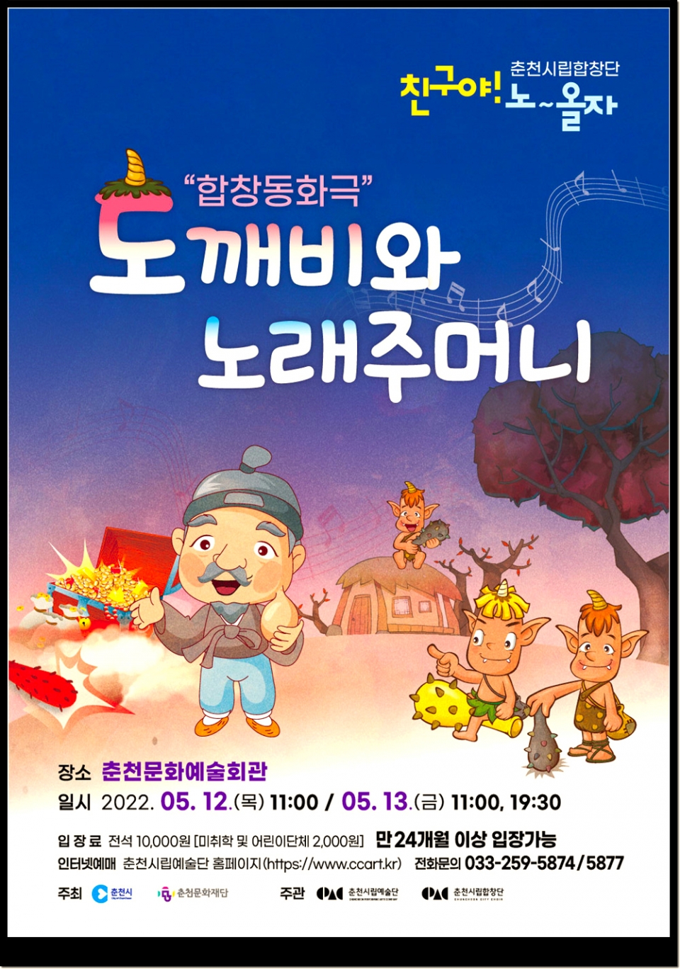 이번 공연에서는 아이들이 쉽게 따라 부를 수 있는 동요와 만화 주제곡을 합창으로 새롭게 연주하며, 모두가 쉽게 이해하고 교훈적인 내용을 담은 동화 ‘혹부리영감’을 각색하여 새롭게 창작한 합창 동화극 ‘도깨비와 노래주머니’로 함께 아이들과의 눈높이를 맞추고 교감하는 공연을 선보인다.