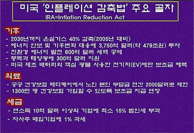 이 법안은 기후변화 대응 차원에서 오는 2030년까지 온실가스 배출을 2005년 대비 40% 감축 목표 달성을 위해 3천750억 달러를 투입하도록 했고, 특히 전기자동차(EV) 보급 확대를 위해 일정 요건을 갖춘 중고차에 최대 4천 달러, 신차에 최대 7천 500 달러의 세액 공제를 해주는 내용이 포함돼 있다. 미국 내에서 제조되지 못한 EV는 이러한 혜택을 보지 못하게 돼 있어, 한국의 전기자동차 미국 수출에 상당한 영향을 미칠 것으로 보인다.