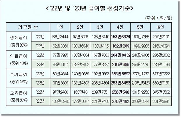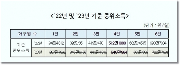 주요 내용으로는 기준 중위소득이 4인가구 512.1만 원에서 540만 원으로 전년대비 5.47% 인상되었으며, 생계급여도 4인가구 기준 153.6만 원에서 162만 원으로 8.4만 원이 인상되어 보장 수준이 한층 강화된다.