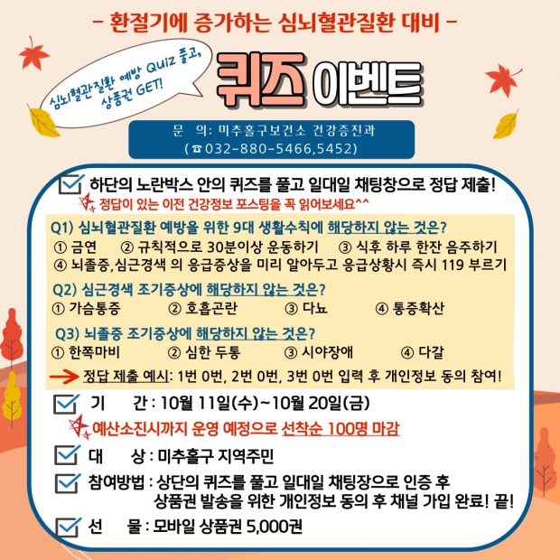 미추홀구보건소는 11일부터 10일간 심뇌혈관질환 예방관리를 위한 퀴즈 이벤트를 진행하고 정답을 맞힌 선착순 100명에게 5천 원권 모바일 문화상품권을 제공한다고 10일 밝혔다.