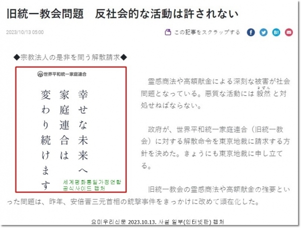 일본 헌법은 ‘신교의 자유(信教自由)’를 정하고 있어, 종교단체를 조직하고 교리를 넓히는데 아무런 문제는 없다. 하지만 종교 활동에 이름을 빌려 부당하게 고액의 헌금을 요구하거나 고액 상품을 팔거나 하는 활동이 허용될 리가 없다. 또 세제면에서 우대되고 있는 종교법인에 대해 그 적격성을 엄격히 묻는 것은 당연한 일이라고 사설은 지적했다.