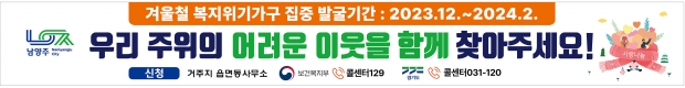 남양주시는 취약계층의 사회적·경제적 위기 상황이 가중되는 겨울철을 대비한 ‘겨울철 위기가구 발굴·지원 계획’을 수립하고, 올해 12월부터 내년 2월까지 3개월간 복지위기가구 집중 발굴 기간을 운영한다고 지난 12일 밝혔다.
