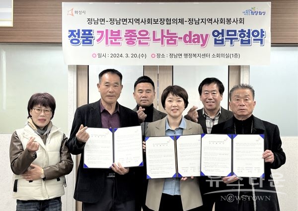 화성시 정남면이 복지 사각지대 해소와 나눔문화 확산을 위해 20일 ‘정품 기분좋은 나눔데이 업무협약’을 체결했다.