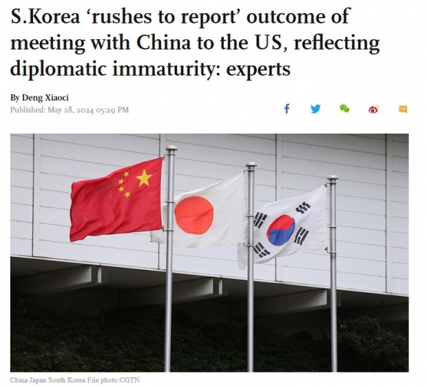 GT는 “중국 관측통들에 따르면, 한국 관리들은 가장 중요한 군사 동맹국인 미국과의 다가오는 회담에서 방금 타결된 중국-일본-한국 3국 정상회담에 대해 공유하고 보고할 것으로 보인다”면서 “그러나, 그들은 또 그 의도적인 합의가 한국의 외교적 미성숙을 반영한다”고 지적했다.