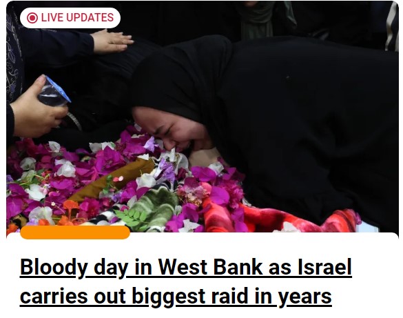 28일 이스라엘은 이스라엘군이 20년 만에 가장 큰 규모의 공습을 계속하면서 점령하고 있는 서안 지구에서 최소 9명의 팔레스타인인이 사망한 것으로 알려졌다. 이 공습에는 수백 명의 병력이 투입되었고, 제닌과 툴카렘(Jenin and Tulkarem) 도시에서 공습이 이루어졌다.