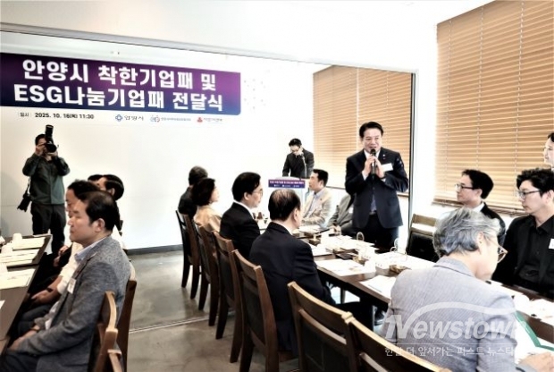 [뉴스타운/송은경 기자] 안양시는 16일 오전 11시 30분 관내 음식점에서 지역사회 기부에 앞장선 기업들을 초청해 간담회를 열고 ‘착한기업’과 ‘ESG(이에스지) 나눔기업’에 감사패를 전달했다.