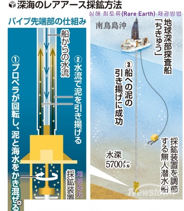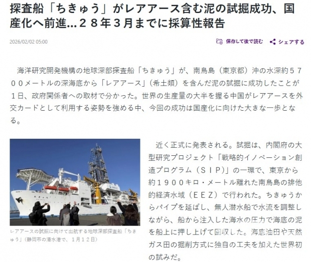 일본 해양연구개발기구(JAMSTEC)의 지구 심부 탐사선 '치큐'(지구, ちきゅう)’가 일본 최동단인 미나미토리섬(南鳥島, 도쿄도) 앞바다의 수심 약 5700m의 심해저에서 ‘레어어스’(Rare Earth, 희토류)를 포함한 진흙 시굴에 성공 사실이 1일 정부 관계자 취재로 밝혀졌다고 요미우리신문이 2일 보도했다.