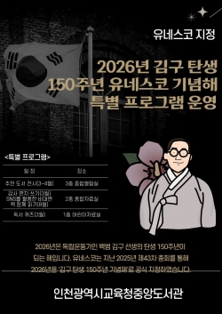 인천광역시교육청중앙도서관(관장 임현자)은 ‘김구 탄생 150주년 유네스코 기념의 해’를 맞아, 백범 김구 선생의 삶과 정신을 기리고 시민의 역사 의식을 높이기 위한 기념행사를 3월부터 8월까지 운영한다고 밝혔다.