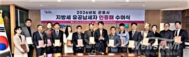 군포시는 지난 5일 시청에서 지방세를 성실히 납부해 시 재정 안정에 기여한 15개 법인을 유공납세자로 선정하고 인증패를 수여했다. 이번에 선정된 유공납세자는 성실납세자 기준을 충족한 납세자 가운데 지방세 납부 규모와 지역 기여도를 종합적으로 고려해 선정됐다.