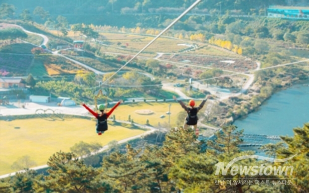 짚와이어는 총연장 550m 규모로 조성됐으며, 경사율 9.9%의 2개 라인으로 운영된다. 이용객은 지방정원의 경관과 하천 주변 풍경을 한눈에 보며 체험할 수 있다.