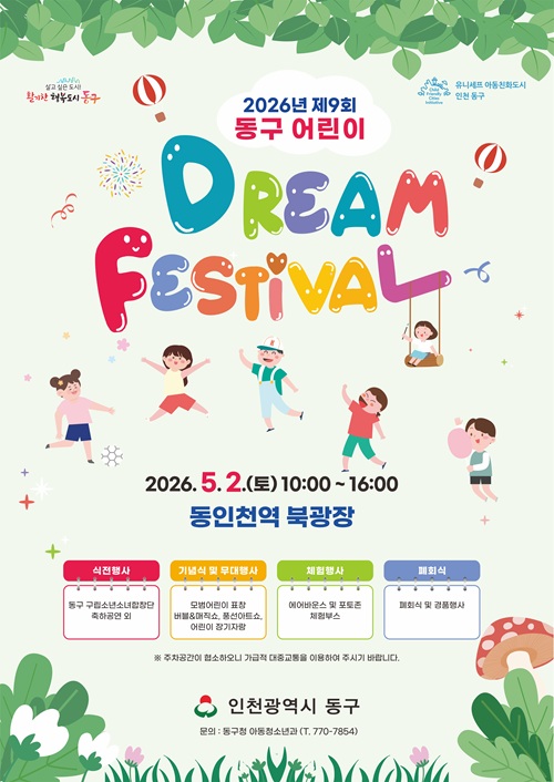 인천 동구는 오는 2일 동인천역 북광장에서 제104회 어린이날을 맞아‘2026년 제9회 동구 어린이 Dream Festival’을 개최한다고 밝혔다.
