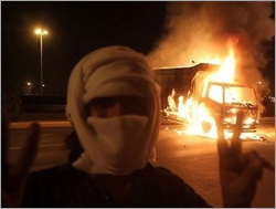 | ^^^▲ 오만 소하르에서. 한 시위대원이 불타는 트럭을 뒤로하고 승리의 V자를 해 보이고 있다. ⓒ AFP^^^ | ||